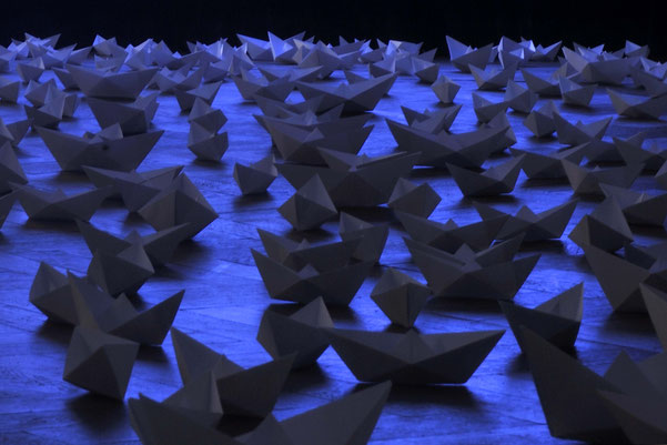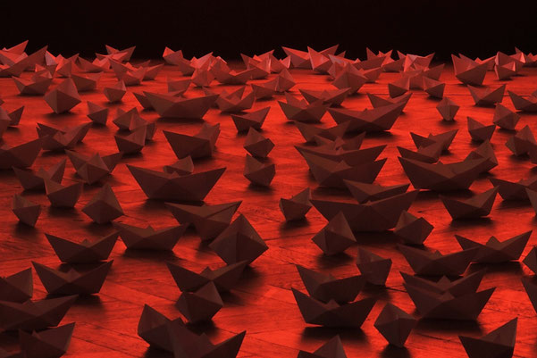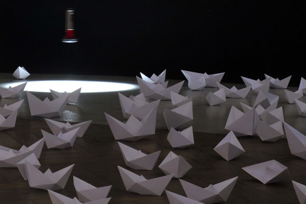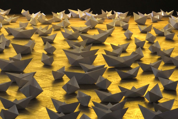 _FUGA (as long as I can see the light) was a contemplative installation that featured more than 700 delicate paper boats scattered across the floor, symbolizing hope, movement, and human vulnerability. At its center glowed a small circle of light — a fleeting sign of safety and belonging — contrasted by a looming dark wall that challenged any sense of security. The work reflected the tension between departure and arrival, faith and doubt, and invited quiet reflection on the enduring human search for light and refuge, even when the idea of home felt distant.